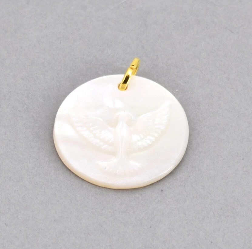Nacre Blanche, Médaille Breloque Gravée Colombe – 15mm, Anneau Doré 4mm (1)