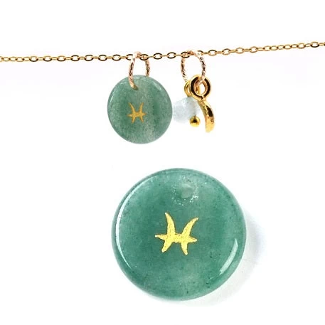Pendentif médaille en aventurine verte 12mm avec le signe astrologique, zodiaque, constellation Poisson doré – Trou: 1mm. En raison du caractère naturel de la pierre d’aventurine verte, la couleur peut varier.