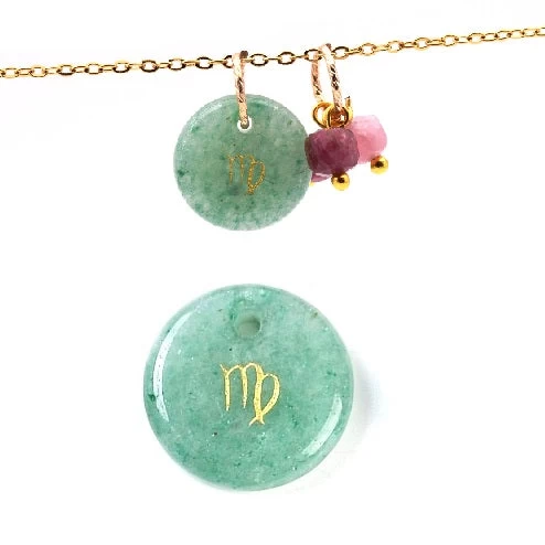 Pendentif médaille en aventurine verte 12mm avec le signe astrologique, zodiaque, constellation vierge doré – Trou: 1mm. En raison du caractère naturel de la pierre d’aventurine verte, la couleur peut varier.