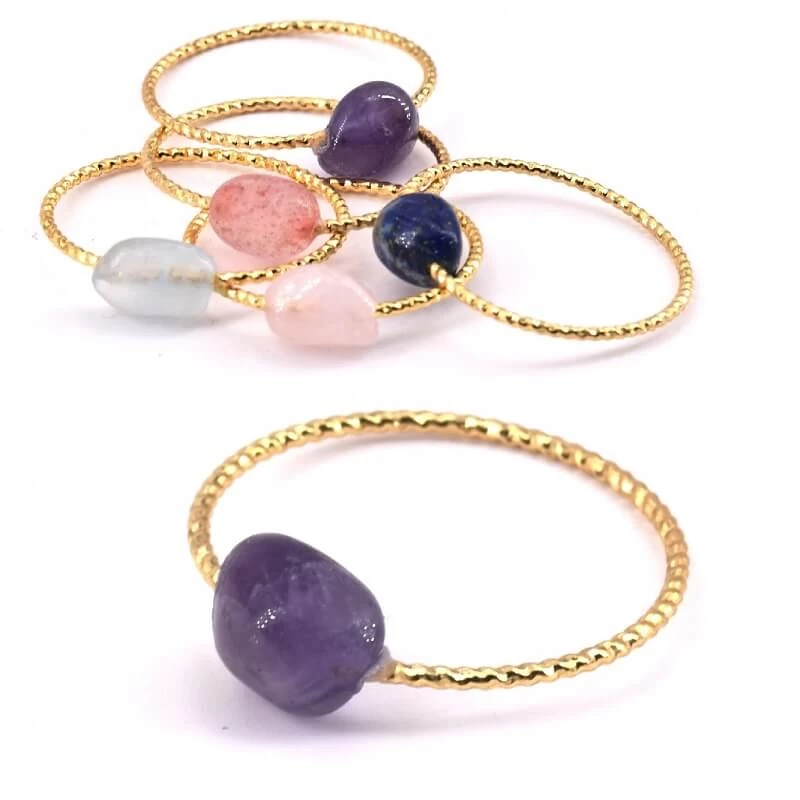 Pendentif Bague Améthyste 22mm Doré à l’Or Fin. Chaque pierre est de forme différente d’environ 7-10mm de longueur. Diamètre intérieur 18mm