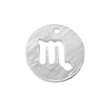 Pendentif charm rond nacre blanche signe astrologique Scorpion 12mm. Trou 1mm. Le signe astrologique, zodiaque, constellation du scorpion est ajouré dans la nacre naturelle.