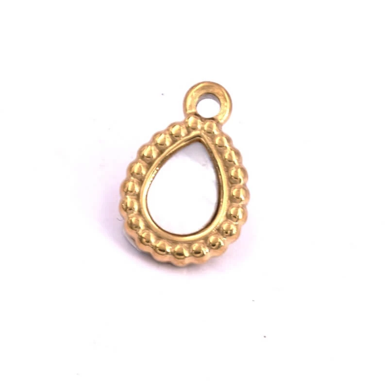 Pendentif goutte acier inoxydable doré avec cabochon nacre 15x10mm. Ce pendentif à un anneau de 1.8mm de diamètre intérieur.