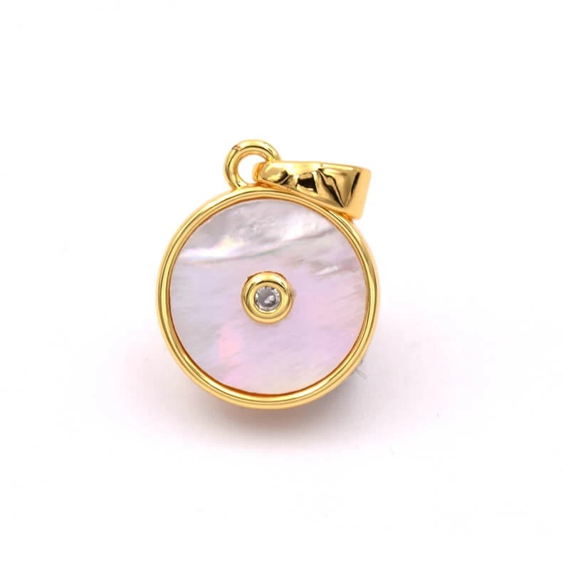 Pendentif breloque charm médaille en laiton doré 11mm nacre et zircon avec bélière – Trou 2mm.