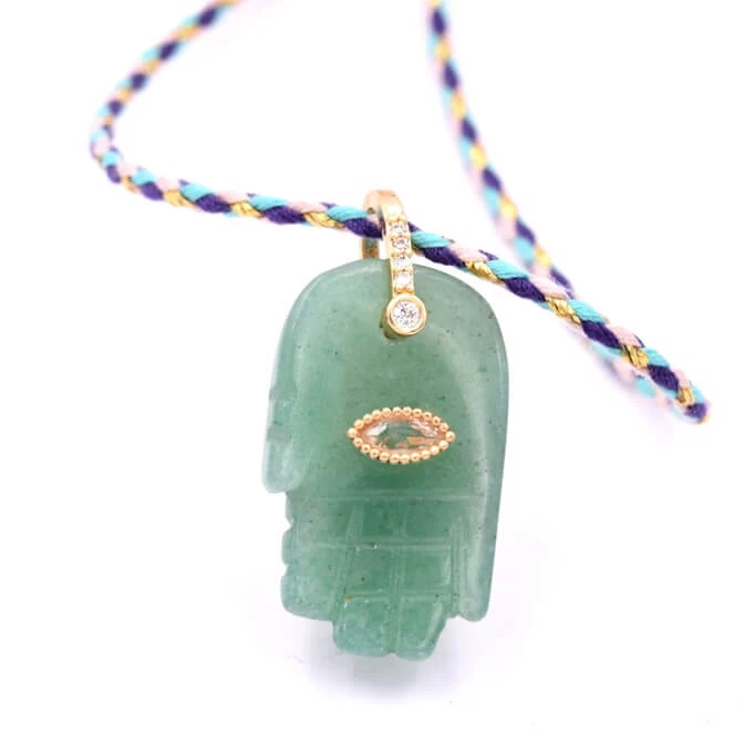 Pendentif main de fatma aventurine et oeil cristal 27x17mm avec bélière et zircons laiton doré. Travail artisanal.